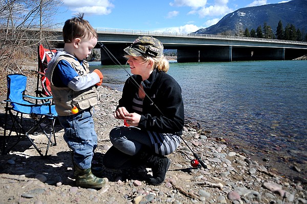 Jenelle Collier of Columbia Falls helps her son Eldon, 3, as they prepare for an afternoon of fishing on the Flathead on Tuesday, March 27, in Columbia Falls.