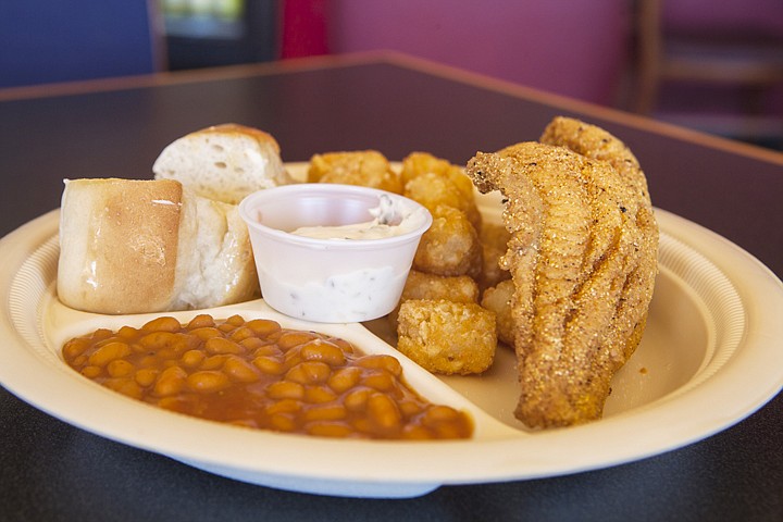 Patrick Cote/Daily Inter Lake Fried catfish, baked beans, bread and tater tots Tuesday afternoon at Tha' Southern Skillet in Kalispell. Tuesday, March, 27, 2012 in Kalispell, Mont.