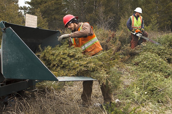 Tyler Just, left, loads cut branches into a wood chipper as Aaron Rasmussen uses a chain saw to remove trees from underneath power lines off U.S. 93 near Whitefish Thursday morning.