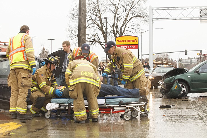 Patrick Cote/Daily Inter Lake Kalispell firefighters remove an injured man from his car after a three-car crash at the intersection of North Main Street and Montana Street Friday afternoon. Friday, March, 30, 2012 in Kalispell, Montana.