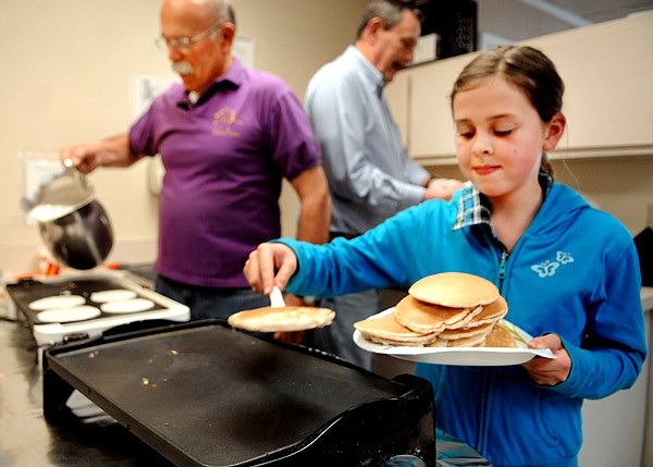 Sarah Illi, 10, of Kalispell, helps her grandfather, Warren Illi of Kalispell, left, make pancakes on Thursday afternoon, March 29, at the Sunriser Lion 38th Annual Pancake Supper in the Saint Matthew's cafeteria in Kalispell. This was her second year volunteering with the supper, her grandfather has been helping with the event for the past 30 years. Also in the background is Foster Swan of Kalispell, center.