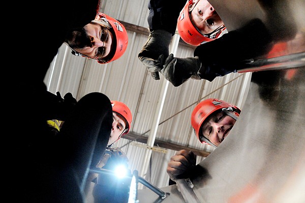 Clockwise from top left, firefighters Greg Daenzer, Rob Cherot, Scott Williams and Jason Schwaiger work on rescuing a victim in a confined space rescue and grain engulfment training exercise on Tuesday afternoon, May 1, in Kalispell. The members of C shift took turns rescuing and being rescued as they completed their training with Captain Cherot, the department's technical rescue specialist.