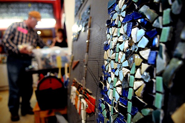 Detail of one of the forthcoming Windows on Whitefish mosaics. In the background participants in Deb Stika's class comb through bins of broken tile to use in their mosaic projects.