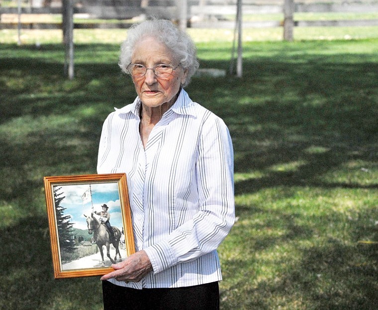 Helen loved to ride her horses and fondly remembers two of their horses, Rambler and Lady. She proudly shows a photo of herself on a tall stallion leading a parade.