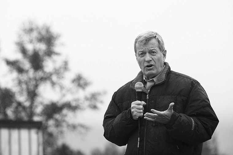 Sen. Max Baucus, D-Mont., speaks Thursday afternoon during the groundbreaking ceremony for the Flathead County Rail Park near Kalispell.