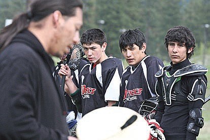 The game opened with more ceremony than most local sporting events, each team sharing its traditional ways with the other. First, Nadzitsaga coach Rick Roy asked the 10Sticks players and coaches to kneel together with his team in a circle before having one of his players recite a prayer.