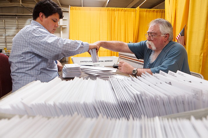 Tony Brockman, left, and Clifford Lee sort through envelopes they stuffed with absentee ballots Friday afternoon at the temporary elections office location in the Country Fair Kitchen at the Flathead County Fairgrounds. "It's been an all week process," Brockman said. Friday, May 4, 2012 in Kalispell, Montana.