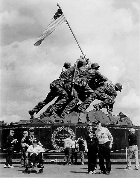 The first one fully developed is a shot of some Honor Flight veterans in front of the Marine Corps War Memorial, depicting the raising of the American flag at Mount Suribachi in February 1945 by U.S. Marines during the Battle of Iwo Jima. Budvarson was a month into his Army service about this time.