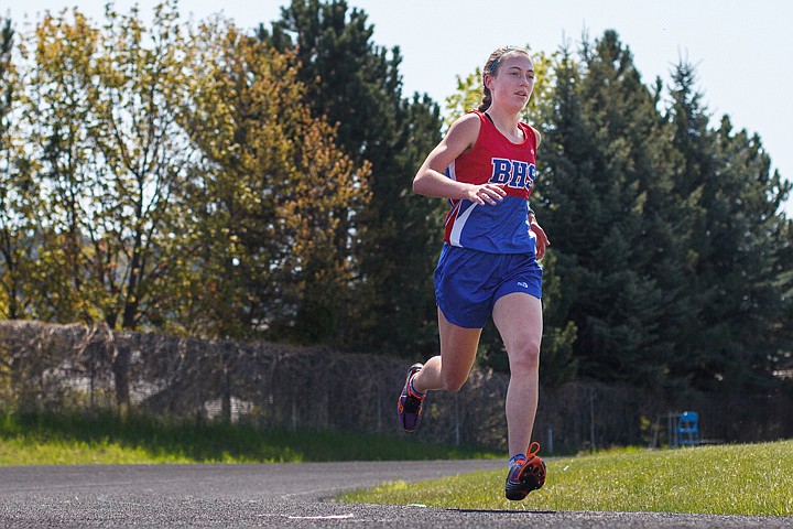 Bigfork’s Makena Morley sets a fast pace in the 1600-meter run at the District 7B track meet Saturday morning at Bigfork High School.