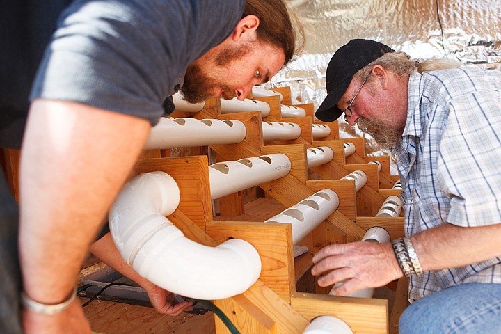The 12-by-20-foot wooden frame and PVC pipes will hold up to 72 “net” pots, which have openings to allow water to flow through roots.