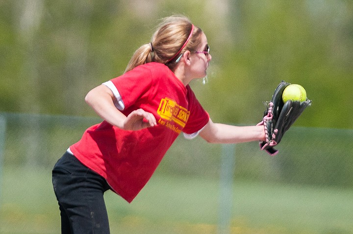 Patrick Cote/Daily Inter Lake Team Les Schwab's Caylie Williams fields a ball Saturday afternoon during a matchup against team Dairy Queen at a softball tournament at Kidsports Complex. Saturday, May 12, 2012 in Kalispell, Montana.