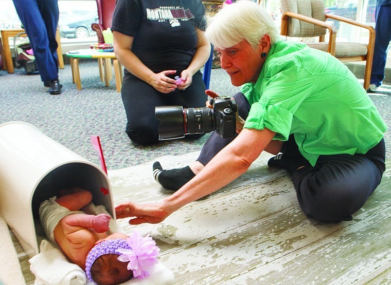 Patrick Cote/Daily Inter Lake Valerie McIntyre gets the attention of two-day-old Avery Lacy during a new born photography session Wednesday afternoon at Kalispell Regional Medical Center. Wednesday, May 9, 2012 in Kalispell, Montana.