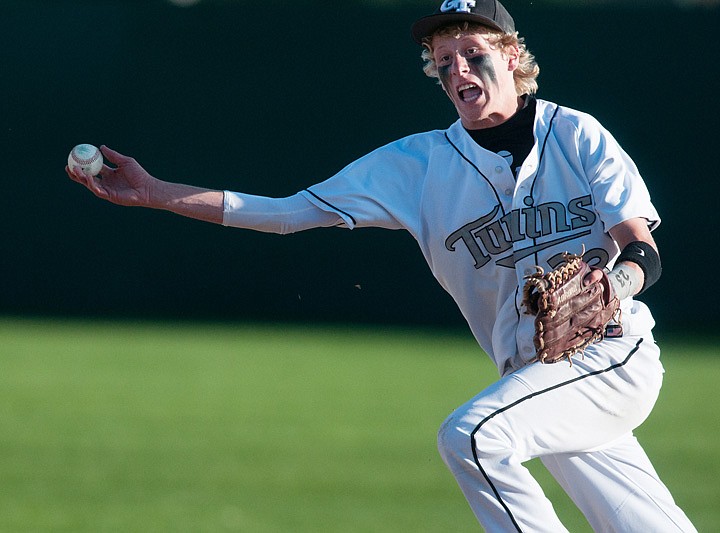 Glacier second basemen Jake Slaybaugh throws to first during the Glacier Twins' 11-1 win over the Libby Loggers Wednesday night at Memorial Field.