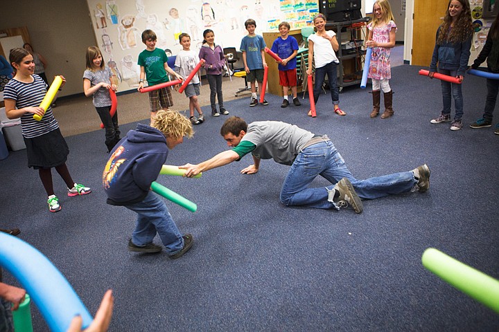 Once the students had slapping down, Gonring taught them how to sword-fight using foam pool noodles. To help the fourth-graders stay focused, he made them an offer before passing out the props.