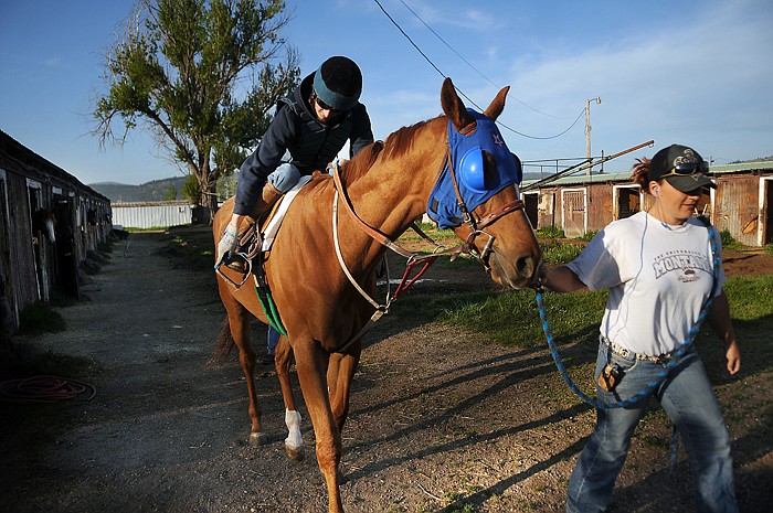 Chantel Fredenberg leads Casey Stoner on RB Encore out for their morning workout on Wednesday, May 16.
