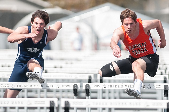 Brothers Nick, right, and Noah James compete in the 110-meter hurdles during the crosstown track dual at Legends Stadium on April 24.