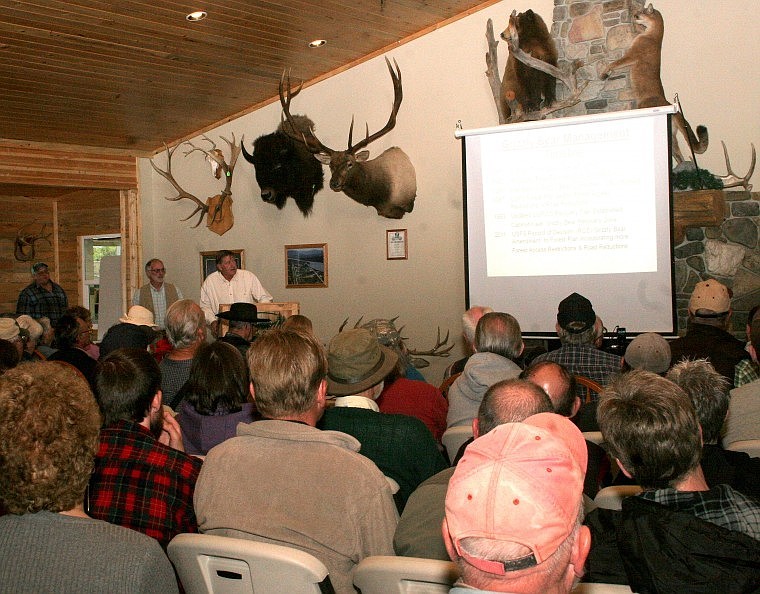 Attendees of the May 10 Town Hall Meeting in Trout Creek listen to biologist Paul Fielder give his presentation about bear habitat acreage.