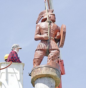 William Denton looks over his handiwork as the Trojan settles onto its new home atop the totem in front of Troy High School.