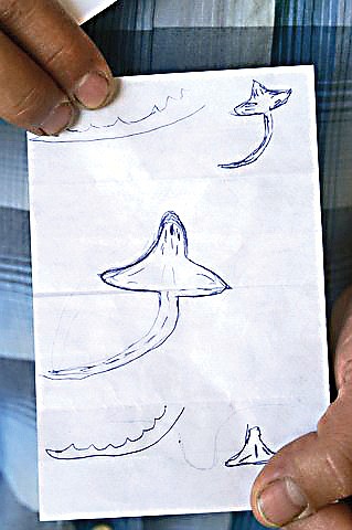 Lagemann estimated the object was about 40 or 50 yards off shore when they first noticed it. They watched through binoculars and afterward he sketched how it appeared to him. He thought the critter was at least 25 feet long. The head was not showing as it moved away, but it had a “whale-like tail” and “spiked dorsal fins.”