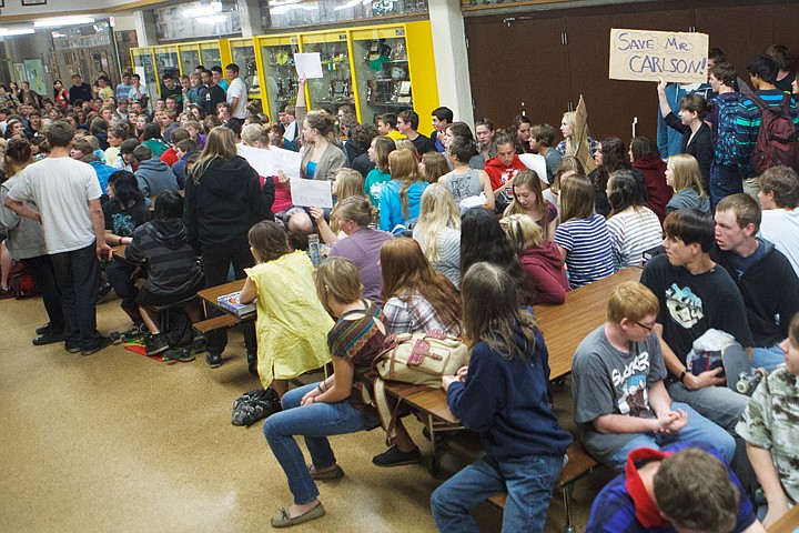 Students fill the common area at Whitefish High School during a protest against the possibility of Principal Dave Carlson's contract not being renewed. After the school superintendent reversed course Monday night, Carlson's job was saved.