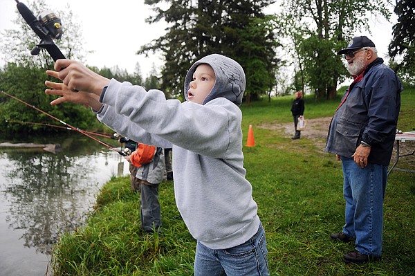 Dawson Fender, a third grader at Creston School, works on casting on Wednesday morning, May 23, at the Creston Fish Hatchery Fish Fun Day.