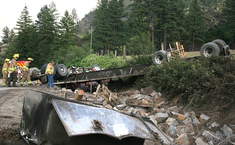 Pieces of the semi-truck were scattered to the side of the highway Thursday night as well as the contents of the load. Plains-Paradise Rural Fire District was on the scene to investigate and help direct traffic.