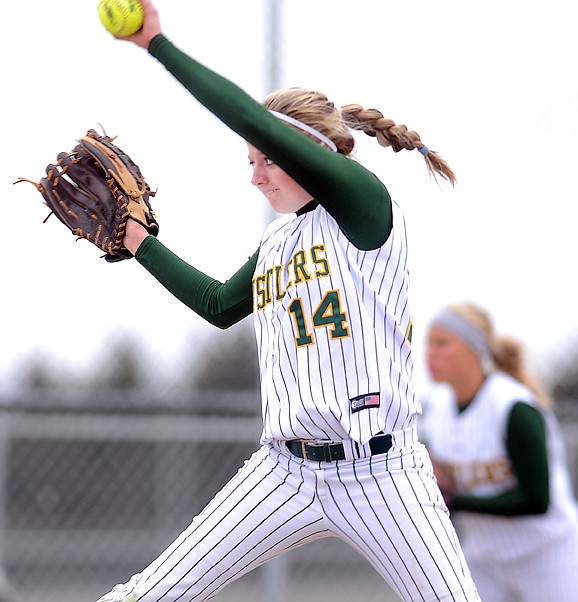 Great Falls C.M. Russell pitcher Quinn Hartman (14) during the semifinal game against the Great Falls Bison on Saturday afternoon at the 2012 State Class AA Softball Tournament in Kalispell. CMR won the game 7-5.