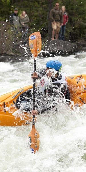 Jared Jimmerson tries to stay upright at the Bigfork Whitewater Festival, heading down the expert slalom event Saturday, May 26.