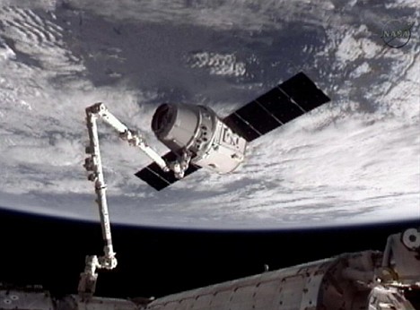NASA astronaut Donald Pettit used the space station's 58-foot robot arm to snare the gleaming white Dragon as the two craft soared 250 miles above Australia, a day after a practice fly-by.