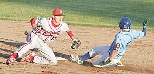 Luke Haggerty slides safely under the tag of awaiting shortstop Dillon Eaves to steal second base in the bottom of the eighth with two out vs Kalispell AA 5-23-12