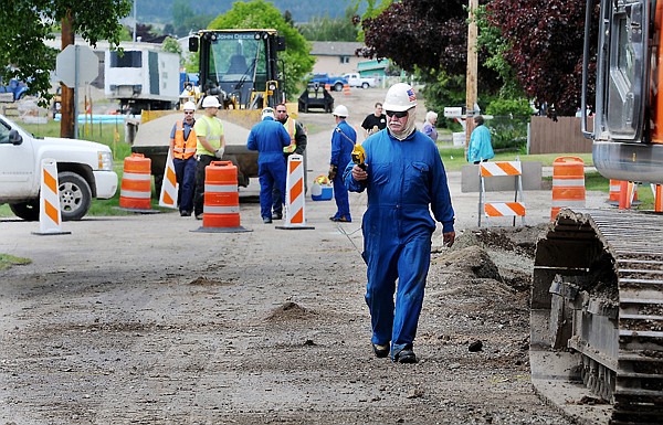 A worker from Flathead Electric walks up Colorado Street on Wednesday afternoon, May 30, in Kalispell. A gas leak was reported near the intersection of W. Colorado and 5th Ave WN just after noon. Gas was clearly visible coming up from the ground. A two block area around the leak was evacuated. The Kalispell Fire Department had two engines on the scene to help monitor the leak and to be ready to respond if needed.