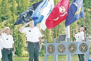 Troy VFW Post 5514 members Mark Olson, left, Herb Gregory and John Brown. John Brown raises the flag over the memorial during dedication ceremonies Monday at Roosevelt Park.