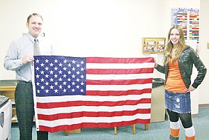 Troy High School Principal Jacob Francom and Troy senior Michaela Curry hold one of the two flags.