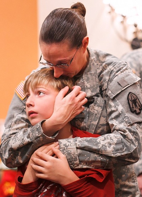 Patrick Cote/Daily Inter Lake Sgt. Aimee Schmidt embraces her son Colton, 8, Monday afternoon after the deployment ceremony for the Montana National Guard 495th at the Hilton Garden Inn. The 495th leaves for Afghanistan on Tuesday. Monday, Nov. 5, 2012 in Kalispell, Montana.