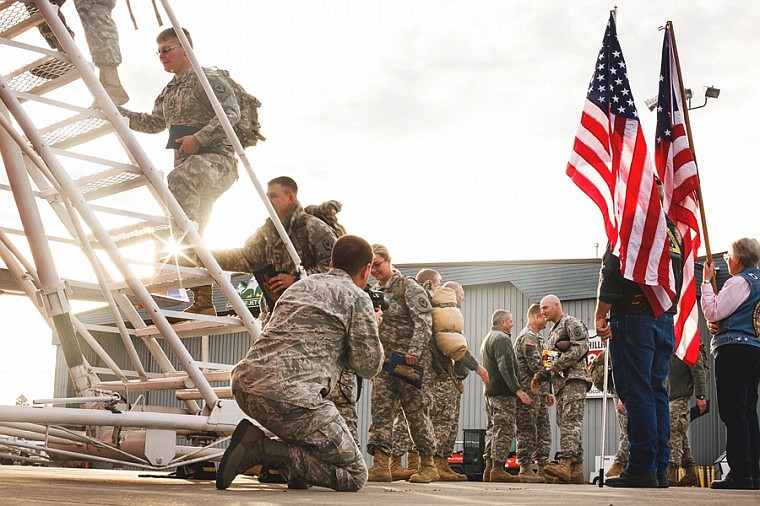 Patrick Cote/Daily Inter Lake Members of the Montana National Guard's 495th Combat Sustainment Support Battalion board a plane Tuesday morning during the deploying from the Glacier Jet Center at Glacier International Airport. Tuesday, Nov. 6, 2012 in Kalispell, Montana.