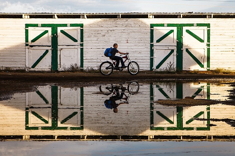 Jordan Burow, 13, rides his bike past a puddle Tuesday afternoon at the Flathead County Fairgrounds in Kalispell.