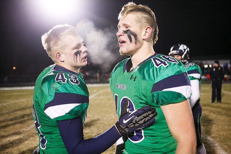 Glacier senior Rial Gunlikson (43) consoles Shelton Todd (46) Friday night after Glacier's loss to Bozeman in the Class AA playoff semifinals at Legends Stadium.