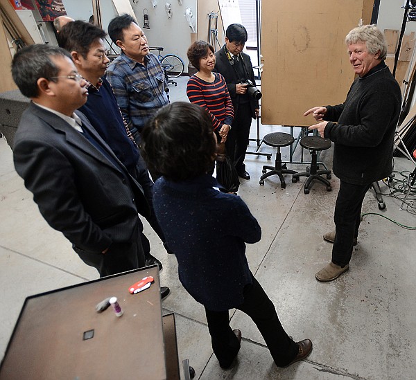 Delegates from China meet with Art Instructor John Rawlings, right, on Friday, November 9, at Flathead Valley Community College. The delegates from left to right are Jiang Wenpei, Chen Li-neng, Wei Xiaofeng, Du Xiaoli, and Li-Shanhua, with Li Qian, the International Education Program Coordinator/Translator at the bottom center.