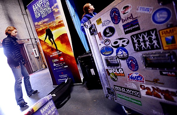 Katie Edminston of Whitefish, a member of the Flathead Nordic Backcountry Patrol, left, and Charla Tomlinson, of Banff, Alberta, begin to set up posters and equipment in preparation for the Banff Mountain Film Festival Monday at Flathead High School. The festival began Monday night and continues tonight with doors opening at 6:30 p.m. This is the 22nd year the festival has come to Kalispell. Proceeds from the event go to benefit the Flathead Nordic Backcountry Patrol.