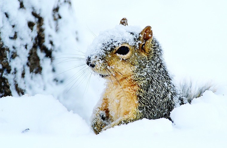 A squirrel looks for its food stash at the base of a tree during the recent heavy snowfall on the east side of Montana.