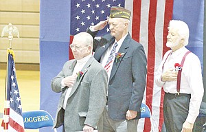 Guest speakers Jim Shadle, left, Ed Croucher and John Alex during the National Anthem.
