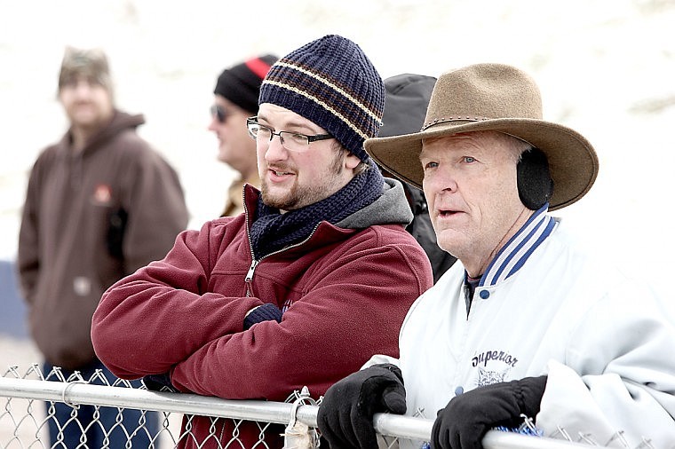 Nicholas Schwaderer converses with former District 14 Representative Gordon Hendrick during the Superior Bobcat semifinal football game.