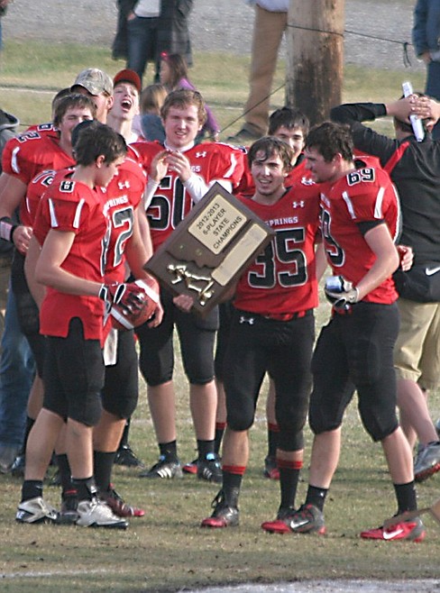 Savage Heat seniors Mike Gray (center), Wyatt Nagy (left) and Dave Cross (right) hold the state champions trophy Saturday, Nov. 17 shortly after their victory over Big Sandy, 77-0, as Queen's "We Are the Champions" plays over the speakers.