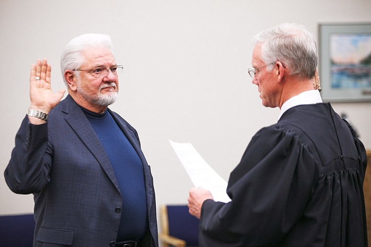 Patrick Cote/Daily Inter Lake Judge David Ortley, right, swears in Flathead County Commissioner Cal Scott on Monday afternoon at the Flathead County Justice Center. Monday, Nov. 19, 2012 in Kalispell, Montana.