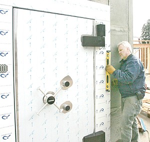 Mark Peterson checks the level of the door during installation of Glacier Bank's brand new Diebold modular vault Tuesday afternoon.