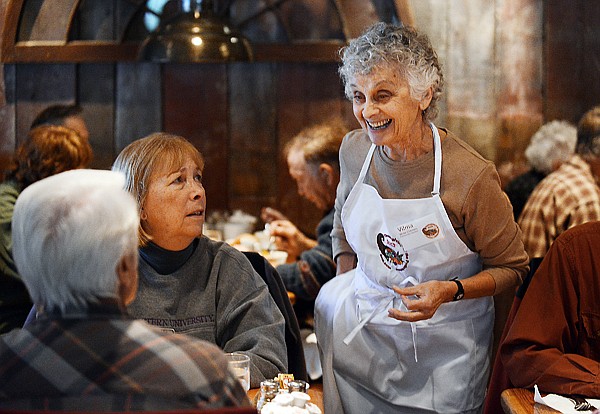 Volunteer Vilma Chemers of Bigfork smiles at patrons at the Pocketstone Cafe Community Thanksgiving on Thursday. In the background is Linnea Armstrong, who splits her time between Bigfork and St. George, Utah.