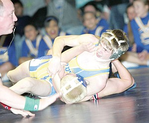 Referee Dean Thompson slaps the mat signifying a pin by Garret Chapel over Mat Cat Adam Richardson at 140