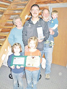 Army Specialist Steve Beaty holds the Purple Heart he received while serving in Afghanistan. His nieces, Emily, 4, and Allie, 6, hold the Purple Heart Citation. To Beaty’s right is step-mother Debbie, and to his left is his father, Mike, who holds nephew Ben. A Taliban suicide bomber sent shrapnel flying, which injured Beaty’s foot, requiring surgery.