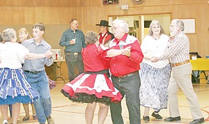 Kootenai Valley Christian School gymnasium was the place to be Saturday evening as folks from Sandpoint, Columbia Falls, Kalispell, Thompson Falls, Bonners Ferry, Spokane and Libby gathered for a bit of old fashioned square dancin'. Kalispell Flatheaders Karen Lee and Roger Jones, center, tear up the dance floor.
