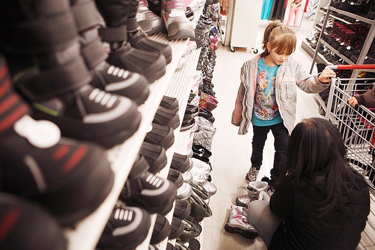 Patrick Cote/Daily Inter Lake Natasha Seeley helps her daughter Nicolette, 7, try on boots Wednesday afternoon at K-Mart as part of Coats For Kids. Twenty-nine children were provided coats, boots, gloves and hats during Wednesday's Coats For Kids event. Wednesday, Nov. 28, 2012 in Kalispell, Montana.